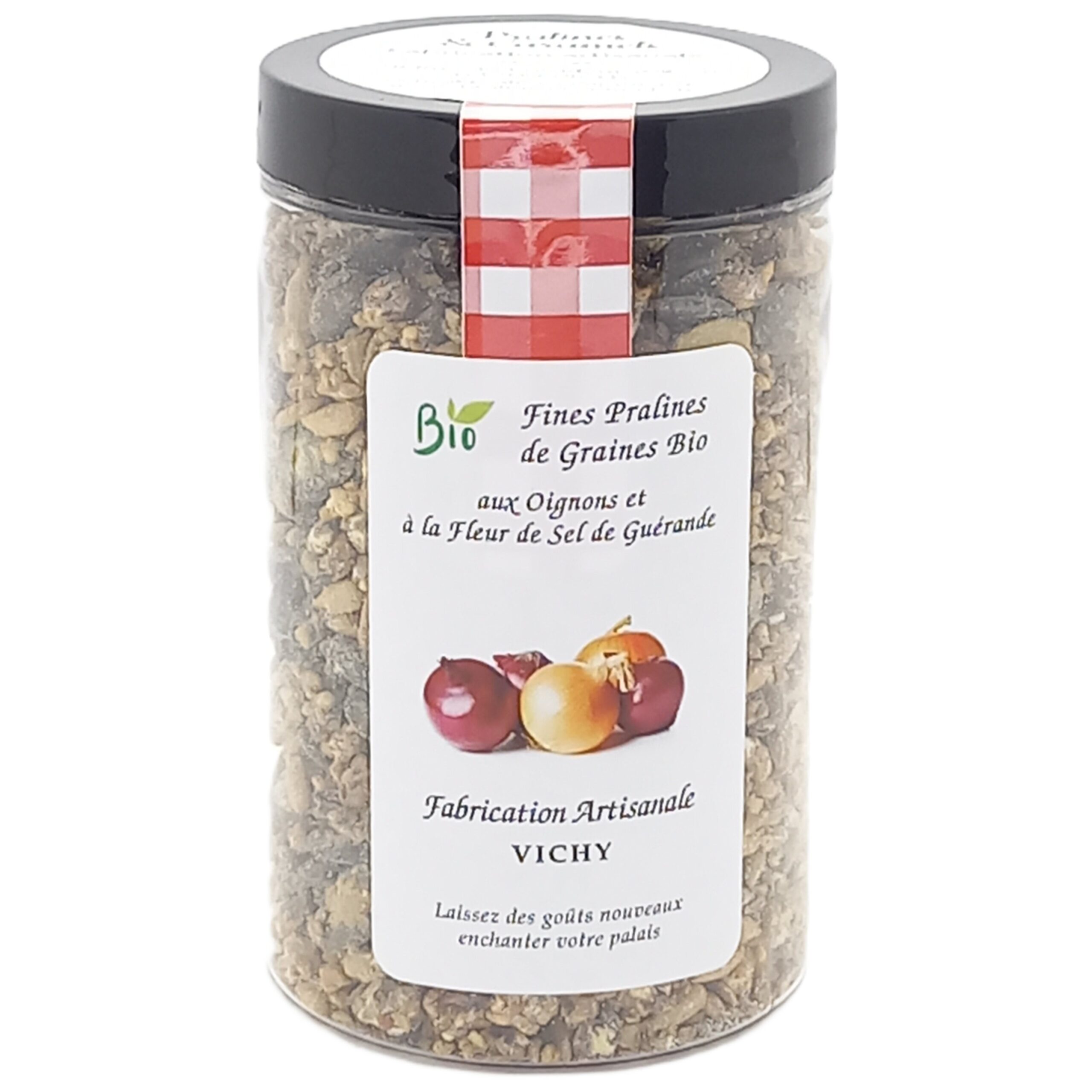 Composition : graines BIO en proportion variable: (tournesol, lin brun, quinoa blanc, rouge et noir, sésame blanc, courge, chanvre et chia) UE et non UE 74%, sucre 20% FRA, poudre d’oignons 5% FRA, fleur de sel de Guérande 1% FRA.