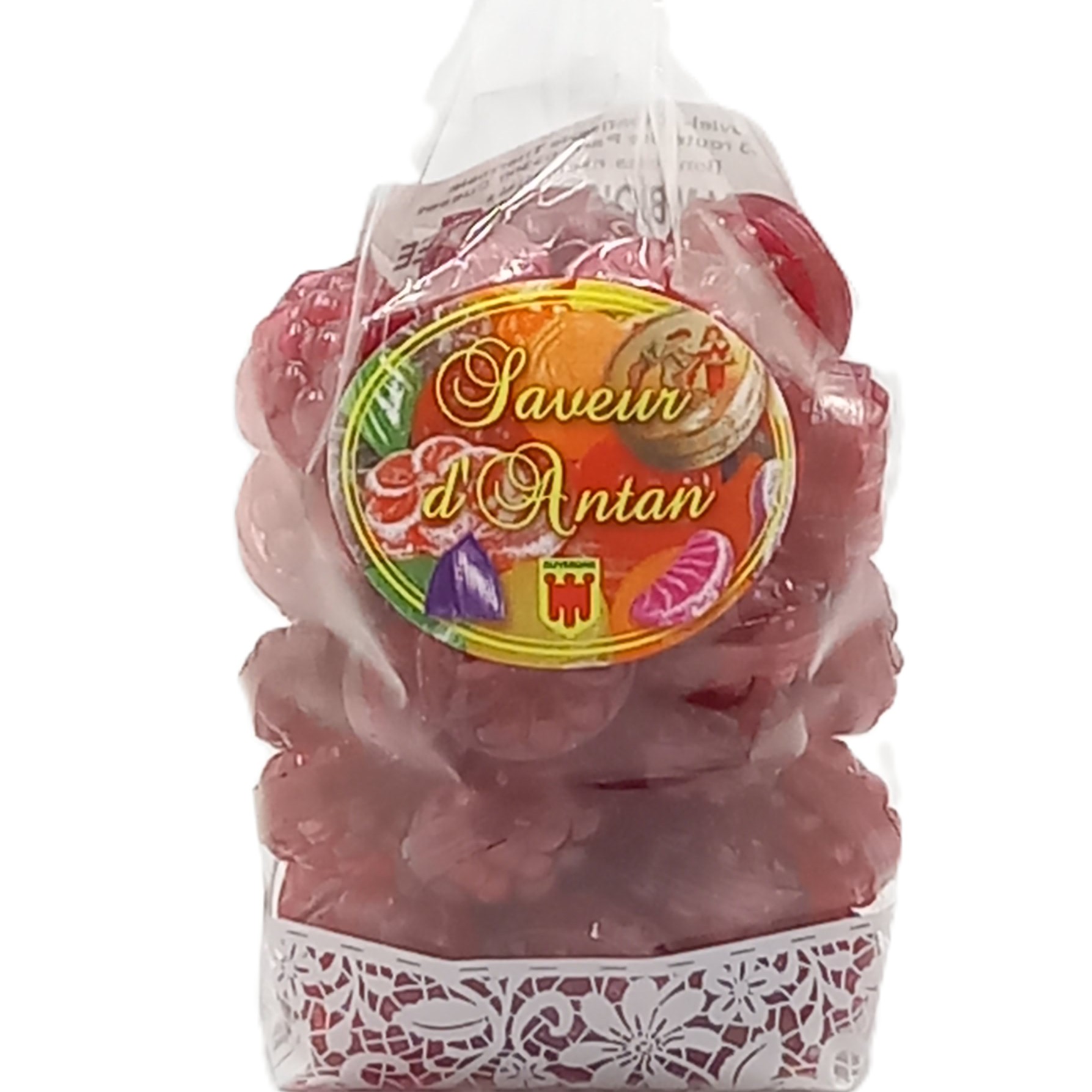 Ingrédients : purée de fruits ( framboise 75% pomme 25%) sucre, sirop de glucose, acidifiant: acide citrique, arômes, colorants: carmin, agent de brillance: cire d’abeille.