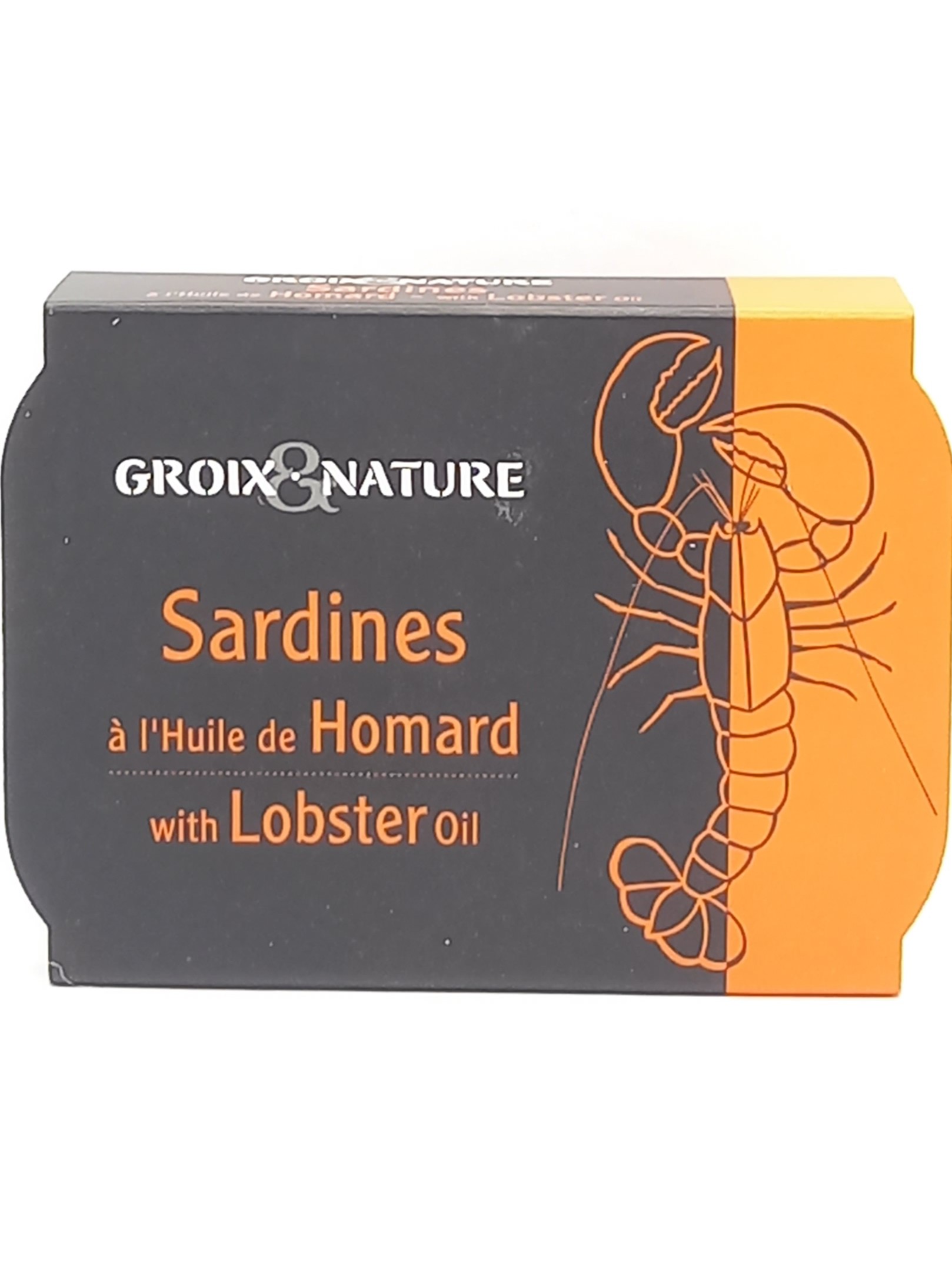 Composition : Sardines 75% , huile de Homard 17% (huile pépin de raisin, homard, échalotes, carottes, ail)et sel.